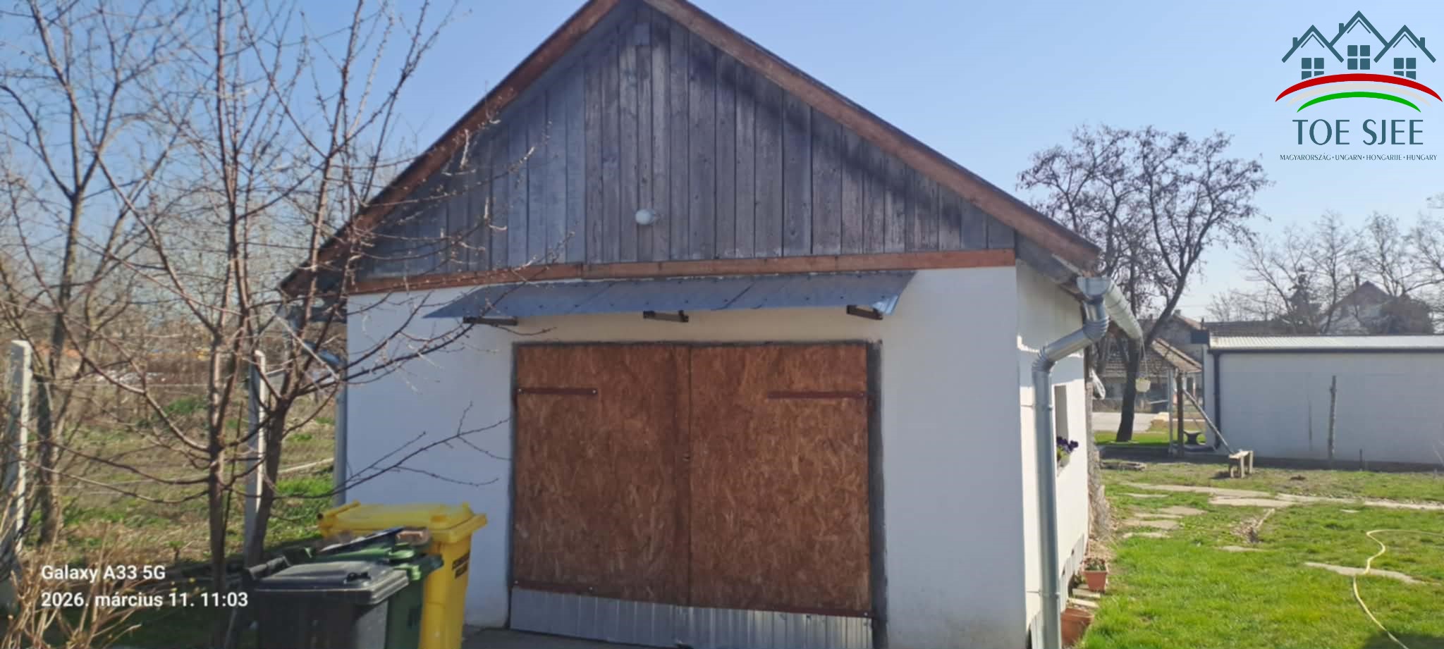 A területen található egy felújított garázs is, ami vályogból és téglából épült, új mennyezettel. A garázs mögött egy kisebb elkerített rész van, ami alkalmas lehet akár kisebb állat tartására is. Ennek az épületnek a tetején is cserép van.